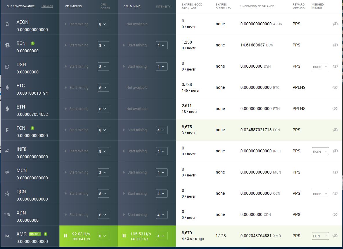 MinerGateには Smart Miner の機能があって、一番掘りやすい通貨を自動で判別して、切り替えながら掘れるらしい。