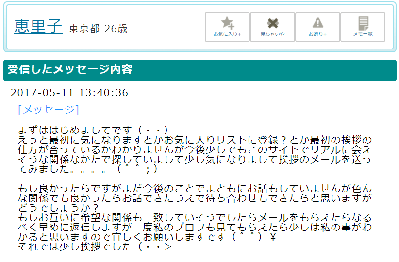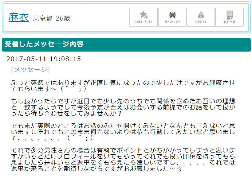 まともな女性がいるとは思えないけど、サクラとやりとりするつもりで、メッセージを送ってみました。