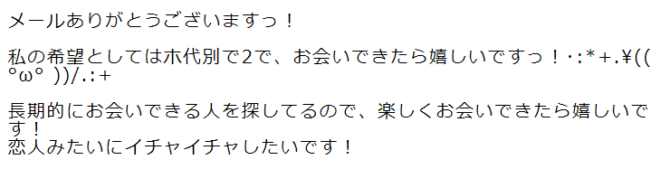 もし良かったらですが近日でも少し先のうちでも関係を含めたお互いの理想と一致するようでして今後予定が合えばお会いする前提でのお話をして良かったら待ち合わせをしてみませんか?