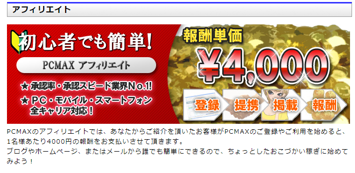 つまりPCMAXを自分のサイトで紹介して、それを見てPCMAXに会員登録すると、成果報酬が得られるのだ!