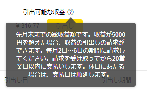 「先月末までの総合収益です。収益が5000円を超えた場合、収益の引き出し請求ができます。